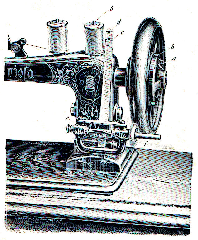 Ist das Spulen beendet, so lege man den Hebel a gegen das Rad, drehe dasselbe langsam gegen sich, bis der Hebel a in den Schlitz h einfällt, worauf das Werk der Maschine in Thätigkeit gesetzt werden kann.