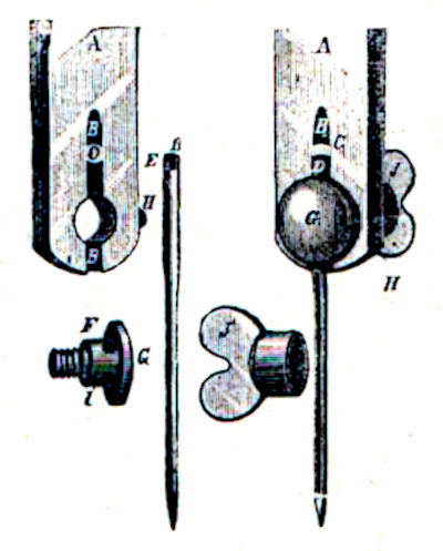 Um die Nadel einzusetzen, schiebe man sie in die Rinne B der Nadelstange A durch das Loch F in der Schraube G, die lange Rinne der Nadel nach links, die kurze nach rechts, so weit aufwärts, bis das flache Ende D mit dem Ansatze E an dem Stege C in der Nadelstange anstößt, und schraube dann die Flügelmutter fest, wodurch die Nadel von selbst richtig zu stehen kommt.